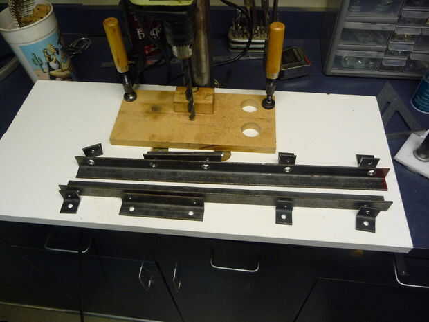 OK, la próxima cosa a notar es mi plantilla de taladro. Esto hizo los agujeros que hace bastante fácil como pude fijado por el tipo de agujero y solo pinza y taladro. Todos mis agujeros estaban en el medio del ángulo, excepto las de la T-fitting como se mencionó anteriormente. La plantilla fue hecha de madera de desecho y asegurada a mi mesa del taladro, que se hizo durante este proyecto (estante de chatarra y 4 pernos gracias). En la segunda foto puedes ver que he sujeta una de las piezas de ángulo corto y perforado en el centro.