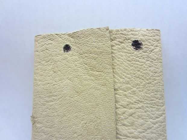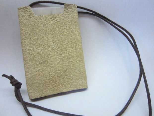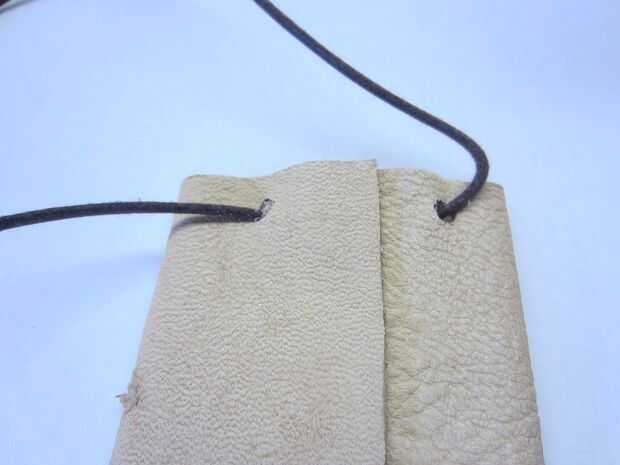 Marque dos puntos en la parte superior de la parte posterior de la cartera, como se muestra. Perforar dos orificios con el punzón de cuero. Pase el cordón de cuero a través de los orificios, como se muestra. Los beneficios de tener una cadena de cuello incluyen: