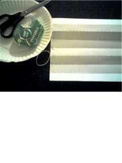 Lo que necesita es: papel, realizar en donde puede caber el dedo pulgar + 1; placa de papel; una banda de goma corto, grueso, claro cinta y tijeras.