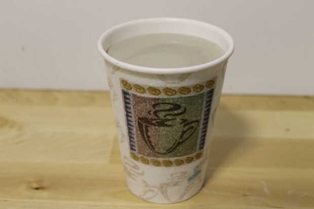 2. tomar la taza de café vacía plástica o de papel que recogen de la lista de materiales y llenarlo con resbalón del envase de 1 galón. Una vez hecho esto coloca a un lado por ahora.