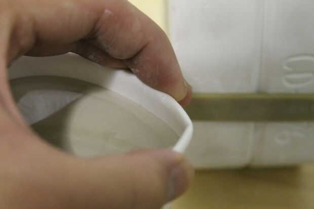 6. tomar la taza de café llenada de deslizamiento y pellizcar el borde de la copa para hacer un buen pico. Esto asegura que no hay derrame y que el slip fluirá fuera de la taza agradable y sin problemas. Estamos haciendo esto porque el agujero Vierta en los moldes no son muy grandes y queremos que disminuya la cantidad de derrame.