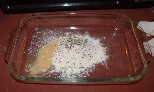 Usted puede usar cualquier plato que te gusta pero un cazuela plato funciona bien para mí, poner unas cucharadas de harina en el plato, agregar condimentos de elección, he usado sal, pimienta, cebolla y ajo en polvo y mezcla bien.