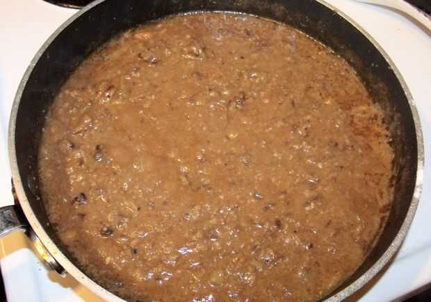 probé la carne cocida y estaba bien así que sólo lo despedazar, puse cada empanada en la salsa y luego los picados all up with mi espátula pero ahora era la salsa fina. Todavía tenía una sartén caliente con tocino y carne de vaca grasa así que un poco más de harina fue agregado y cocido hasta marrón claro, luego vierte la mezcla de carne y salsa en la sartén y revuelve hasta que se espese