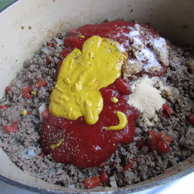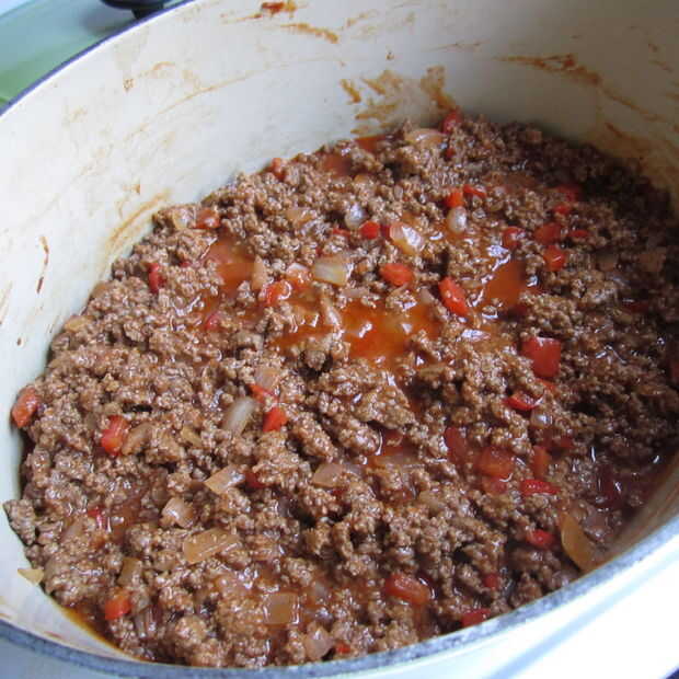 Gire el calor a medio-bajo y deje que se cocine a fuego lento al menos media hora, cubierto pero con la tapa rajada. Tienes que mezclar esto muy a menudo - no hay suficiente líquido para evitar que se quema en el fondo de la olla si lo deja, y el azúcar sólo empeora!