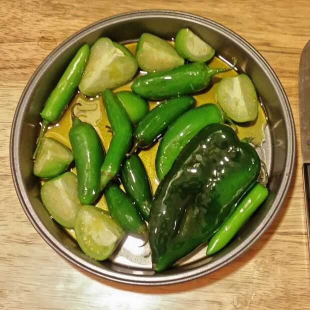Para añadir cierta complejidad a mi Chile, me decidí a mitad de mis pimientos y tomates asados. Esto añade un leve ahumado y mellows hacia fuera el calor un poco. Simplemente mezcle los pimientos enteros en aceite de oliva y asar durante 15-20 minutos. Asegúrese de darles vuelta a la mitad. Cuartean mi tomatillos para asar así eran más fáciles de manejar más adelante y así no explotar dentro de mi horno [algo que definitivamente nunca me ha pasado.