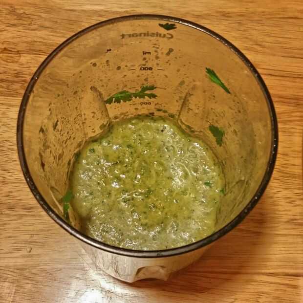 Una vez el pimiento asado y lo suficientemente fresco, cortar los tallos y se mezclan con los tomatillos, el líquido en la cacerola de la asación y el cilantro. Puede que necesite añadir unas cucharadas de caldo.