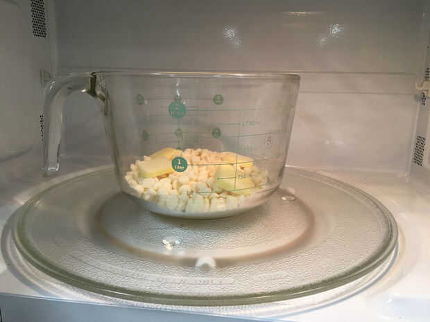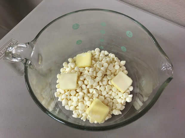 Vierta los chips de chocolate blanco en un bol de vidrio junto con 4 cucharadas de mantequilla. Coloque un tazón de fuente de microondas por 30 segundos, remover y microondas durante 20 segundos más si es necesario, hasta que se derritan.