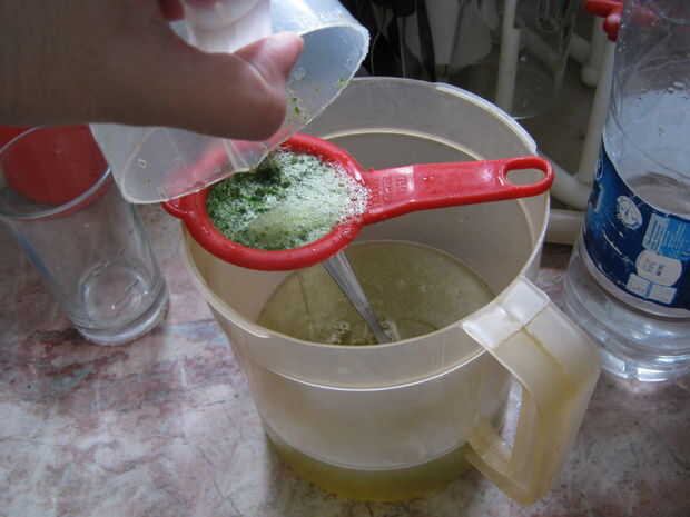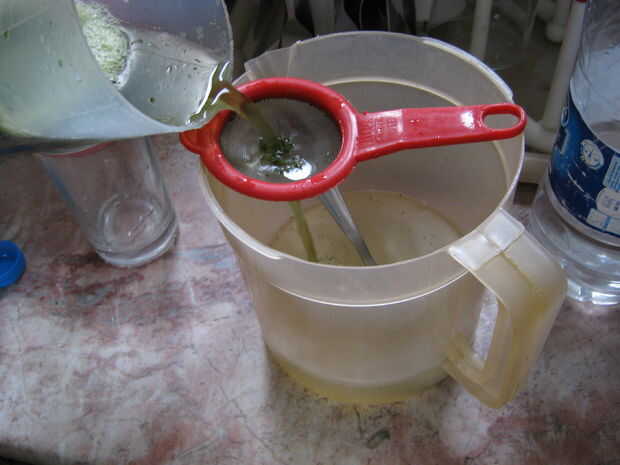 Cuele la mezcla de menta, agregar a la mezcla azúcar/limón/sal pimienta y agua de paso de 1.