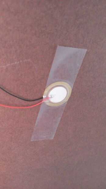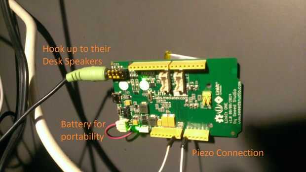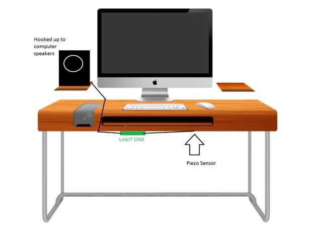 En primer lugar, usted puede cinta simple los elementos piezoeléctricos (atado con alambre al LinkIT) en la parte inferior del escritorio. Esto detectará cambios grandes vibraciones a la mesa.