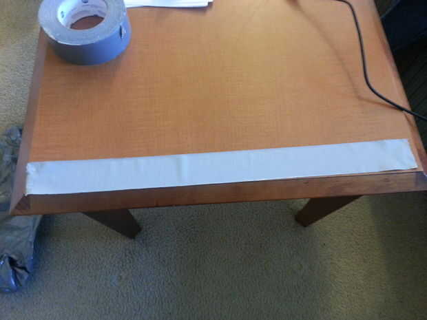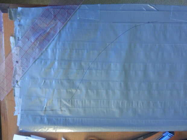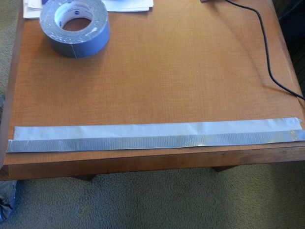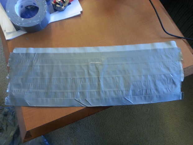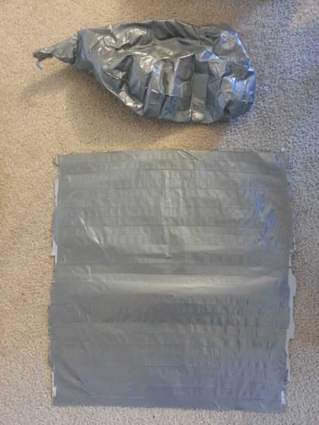 Comencé haciendo una lámina plana grande de cinta adhesiva - ponga una tira hacia abajo el lado pegajoso hacia arriba, entonces lugar uno a mitad de camino hasta el lado pegajoso hacia abajo. Voltear y repetir hasta que consigues algo más o menos cuadrado de 23".