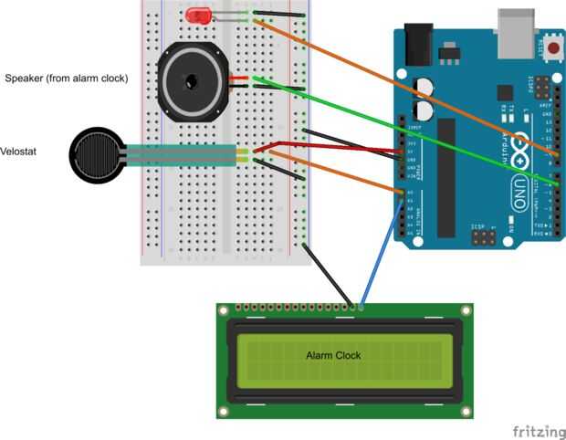 Desde el lado de la señal del despertador Conecte la línea de alimentación a un pin analógico (hemos utilizado el pin A3) y el otro a la línea de tierra. Por el lado de altavoz Conecte un lado a tierra y el otro a un pin PWM (hemos utilizado el pin 6). En el fritzing diagrama asumir sólo la pantalla LCD es el reloj de alarma.