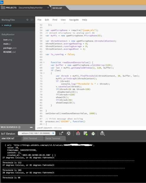 function readSoundSensorValue() { var buffer = new upmMicrophone.uint16Array(128); var len = myMic.getSampledWindow(2, 128, buffer); if (len) { var thresh = myMic.findThreshold(threshContext, 30, buffer, len); myMic.printGraph(threshContext); if (thresh) console.log("Threshold is " + thresh); v.saveValue(thresh); if(thresh>50 && thresh<150) showNormalLCD(); if(thresh>=150) showLCD(); if(thresh<50) showSleepLCD(); } } setInterval(readSoundSensorValue, 1000);