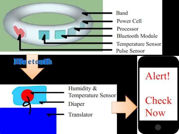 Las medidas de banda de tobillo la temperatura corporal del bebé y su corazón batir y luego envían estos datos a la vía bluetooth y la traductora, junto con los datos del sensor de humedad, envían que los datos a una nube se separa a través de red wi-fi. La aplicación puede obtener todos los datos en cualquier lugar que cualquier momento siempre y cuando no hay conexión a internet.