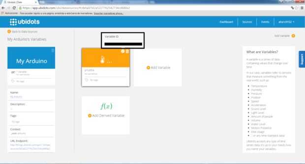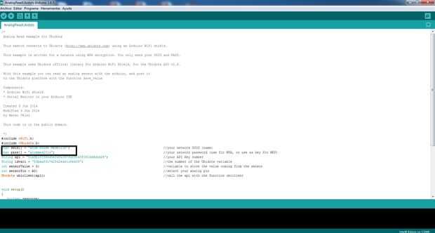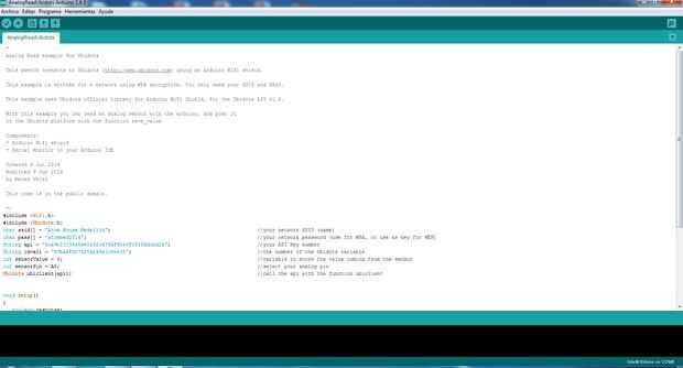 En el ejemplo se observa un código lee el valor de un sensor en un entrada analogica y lo envia hacia el servidor, solo hace falta configurar la SSID y la WEP/WPA clave de la misma rojo yl como API de la variable y la API, estas las podemos encontrar en donde tenemos nuestras variables personales.
