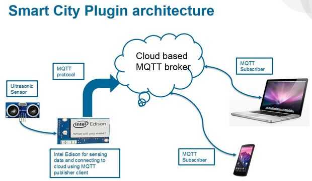 Smart City Plugin utiliza protocolo MQTT para conectar tablero de Edison de Intel para el corredor MQTT basada en cloud.