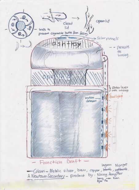 Para hacer el entero 'lanzamiento de rubbishing' experiencia 'conveniente' y 'complicaciones', decidí hacer un 360grados de apertura para un fácil acceso para la gente lanzar basura fácilmente en el cubo de la basura. El cenicero está situado en la parte superior del recipiente.