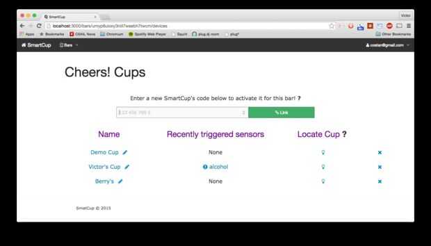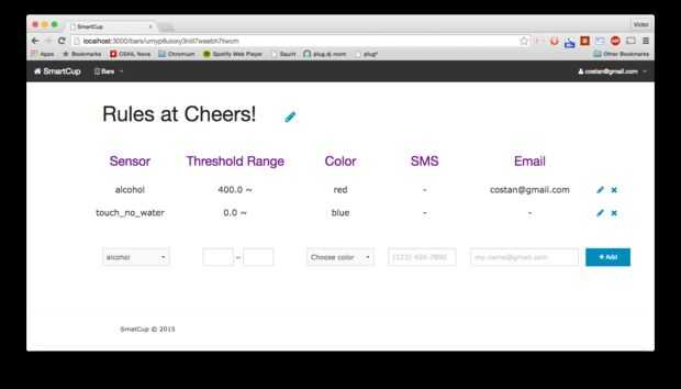 Nuestra interfaz de usuario es una versión altamente simplificada de Si esta entonces que (IFTTT). El bar propietario puede obtener notificaciones en función del valor de cada sensor conectado a la taza. Las notificaciones pueden ser discretos parpadeos del LED, la copa o más molesto e-mails y mensajes de texto (SMS).
