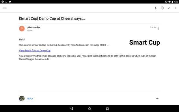 En nuestro ejemplo, hemos establecido una notificación que se activa cuando la Copa detecta que su patrón ha tenido demasiado a beber. Es un evento de alta responsabilidad, así que nos provocan LED rojo de la taza parpadeando, y también recibimos un correo electrónico. También hemos pedido la Copa que nos notifiquen cuando está vacía y es sostenido por un patrón. En ese caso, nos parpadea LED azul de la Copa, para captar la atención del barman.