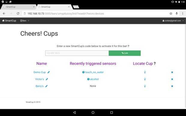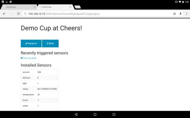 Bares de alta tecnología y los organizadores del partido pueden mantener un dispositivo móvil, como una tableta, detrás del mostrador y haz un resumen de todas las copas en la barra. Nuestra interfaz de usuario Web apunta a los navegadores de escritorio y móviles y utiliza la API Push polyfill mencionado anteriormente para actualizar partes clave de la interfaz de usuario, por ejemplo, la lista "Recientemente provocó sensores". Así, la interfaz de usuario Web actualiza inmediatamente cuando una taza detecta una responsabilidad potencial, capacitar a nuestros usuarios a responder rápidamente y prevenir un problema potencial de escalada.
