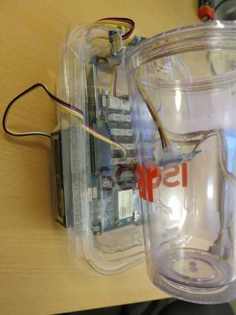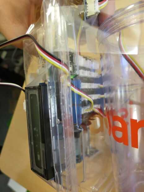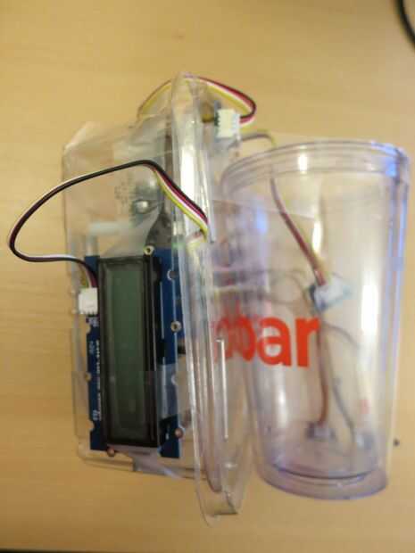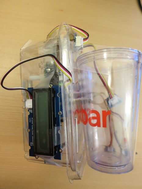 Desafortunadamente, el sensor de agua no está en la parte inferior de la Copa. Esto es una consecuencia directa del hecho de que estamos utilizando una taza más grande, y la longitud del cable del sensor se convirtió en un cuello de botella. En el producto final, tenemos la visión de tener el sensor muy cerca de la parte inferior de la Copa, por lo que desencadena cuando la Copa está casi vacía, y el barman debe considerar ofrecer al cliente otra bebida.