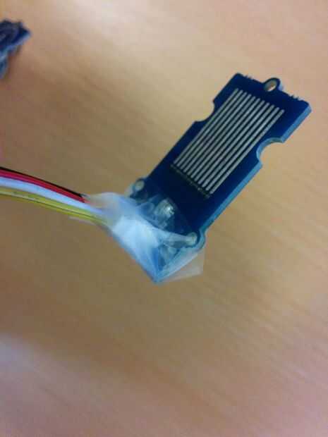 ADVERTENCIA: encontramos que es muy importante en la cinta los cables del sensor de agua firmemente, como se muestra en la última foto. No hacemos que bien durante el roadshow de IoT demo y el agua se metió en el área cubierta, que causó el sensor obtener flakey justo antes de la demostración.