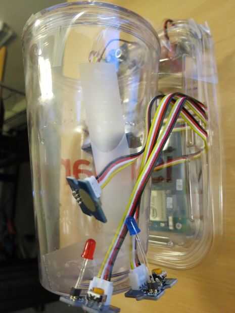 Hemos grabado las luces cerca de la parte inferior de la taza. Esto es más cercano a la visión del producto final, que tiene los LEDs incrustados en la parte inferior de la taza, de modo que la parte inferior ilumina de color azul o rojo discretamente.