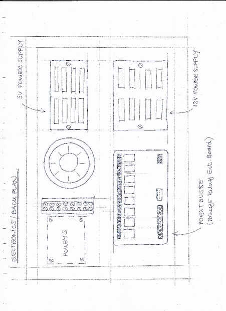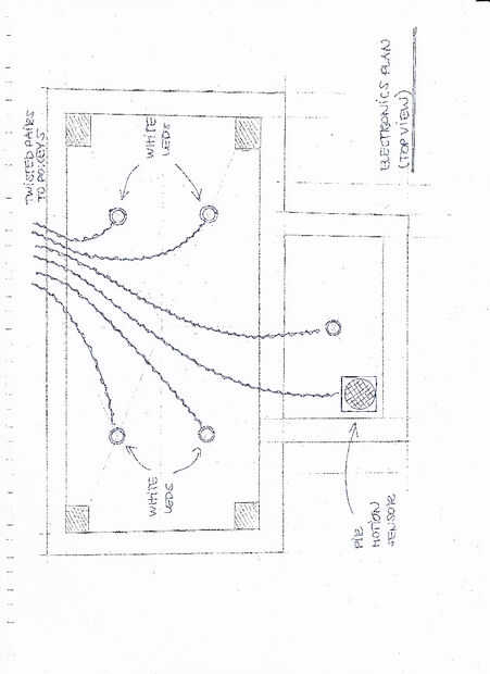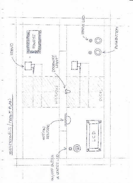 Electrónica montada en la parte delantera de la casa. Encendido / apagado interruptor se utiliza para activar o desactivar el controlador PoKeys, también hay un LED de estado. Pantalla LCD muestra los Estados de todos los sistemas instalados; calefacción, ventilación, iluminación, había automatizado de puertas y ventanas y un sistema de alarma de seguridad, que será controlado por los 2 botones a la derecha. Botón rojo se utiliza para encender el sistema de alarma y el botón verde se utiliza para apagar el sistema de alarma. Correspondiente LED muestra el estado del sistema de alarma. Servos se utilizan para abrir la puerta y una ventana.