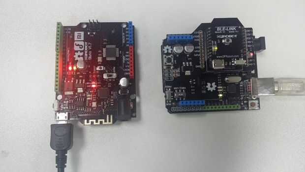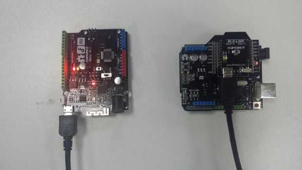 Bueno, a continuación es la clave para la comunicación. Usé dos módulos para probar la comunicación de BLE-Link, como se muestra en la imagen siguiente. Uno es Bluno, que se construye Ble-link. La otra es la combinación de Arduino UNO y Ble-link. Ble-link generalmente tiene dos modos incluyendo roles centrales y periféricas, que debe ser programado con comandos AT. Para un teléfono inteligente, es siempre juega un papel central. Así el enlace Ble conectar el relé naturalmente está desempeñando un papel periférico.