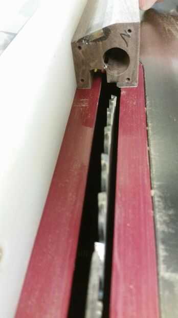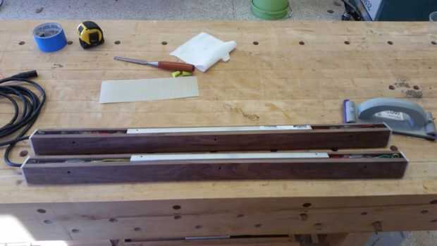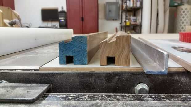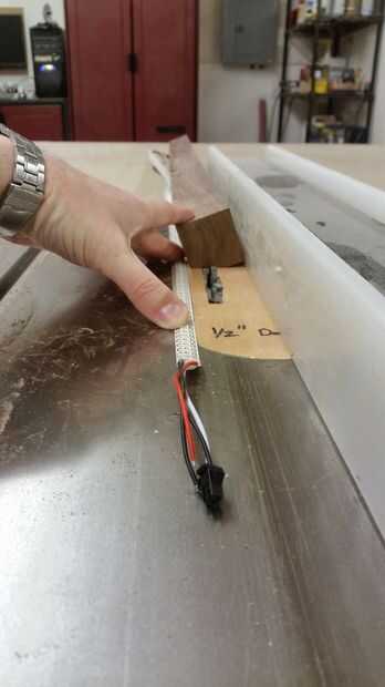 Entonces corté un surco en la parte inferior para hacer espacio para los cables, aproximadamente 1/2 "x 1/2" a mi me funciono bien. Entonces yo cortar las ranuras necesarias para obtener una espesor de 1/8" 3/4" x 3/4" material de aluminio de ángulo para quedar al ras de la parte posterior. Se trata de cómo montarlo invisiblemente en la pared y permite para centrado de la luz independientemente del espaciamiento de postes de 2 x 4 detrás de la luz. Comprobar que todo encaja (LED tira y ángulo de aluminio) y luego cortar a la longitud.