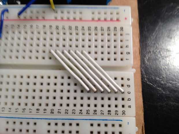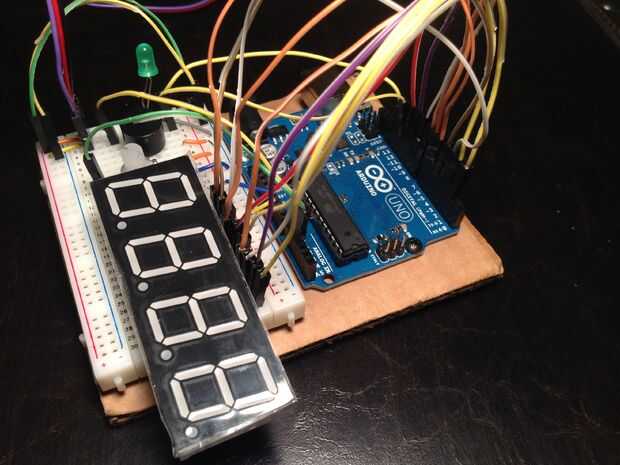 5.) el cableado hasta la pantalla de 4 dígitos 7 segmentos. (Esta parte es la más confusa, así que he dividido para arriba en pasos más pequeños. Ver la imagen con la pantalla de 7 segmentos en él para obtener ayuda. También, si usted está teniendo problemas de conexión a todos sus cables, mira cómo mina conectado a los cables blancos.)