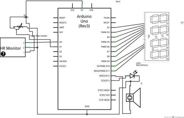 4.) Conecte el monitor de ritmo cardíaco pulsesensor. Cable rojo va a 5V, cable negro está conectado a tierra y el hilo púrpura debe ir al pin analógico 0.