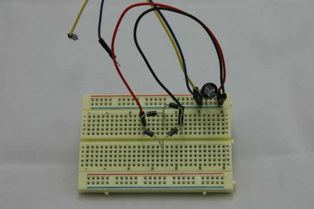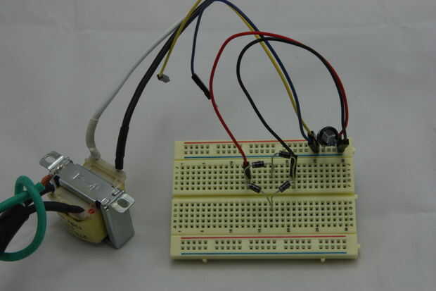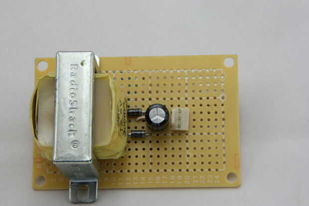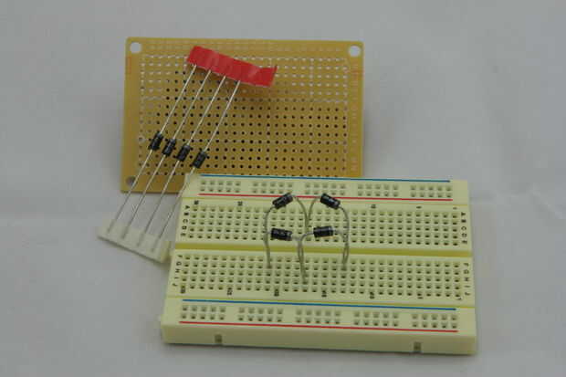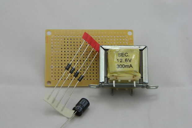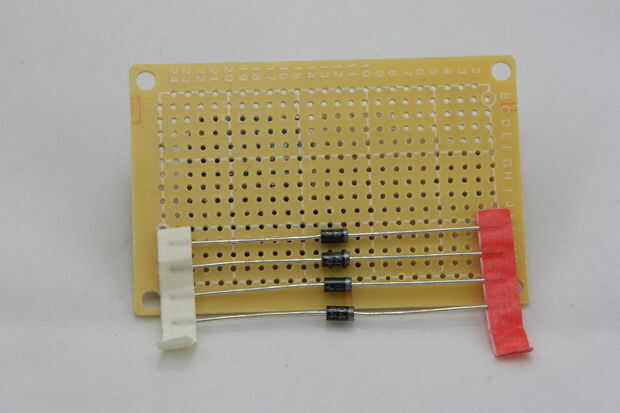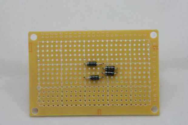 1) crear el puente rectificador - usando los 4 diodos vamos a crear el rectificador que convertirá el AC corriente DC y nos proporciona un voltaje positivo constante de CC. Imágenes 2,4,5 describen el diseño y los componentes necesarios para esta parte. Observe la dirección de los diodos y como mitad del rectificador está ubicado bajo el transformador. Colocación de esta porción debe permitir el transformador para sentarse encima de ella y exponer lo positivo la mitad (como se muestra en la imagen principal). Esto permite fácil conexión del transformador secundario a nuestro rectificador y ayudar a ahorrar algo de espacio (imagen 7). Puede utilizar el diodo conduce para hacer la conexión de rectificadores en la parte inferior de la Junta Directiva (imagen 8)