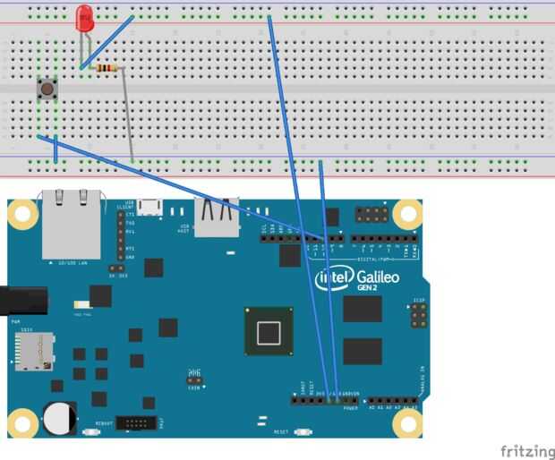 Conectar el LED al pin 8 de la Galileo y el botón con el pin 10. Por supuesto puede cambiar estos pines, pero no te olvides de cambiar los pasadores en el sketch de Arduino más tarde.