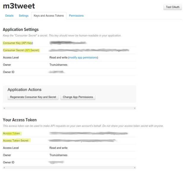 Después de que has creado tu propia aplicación ir a la gestión de la aplicación, seleccione su aplicación y la ficha ''llaves y fichas de acceso ". Aquí usted tiene que crear su propio acceso Token y el Secret Token de acceso. Después de que hayas creado los tokens, abrir el script de python adjunto y editarlo con sus tokens (véase también adjunto captura de pantalla):