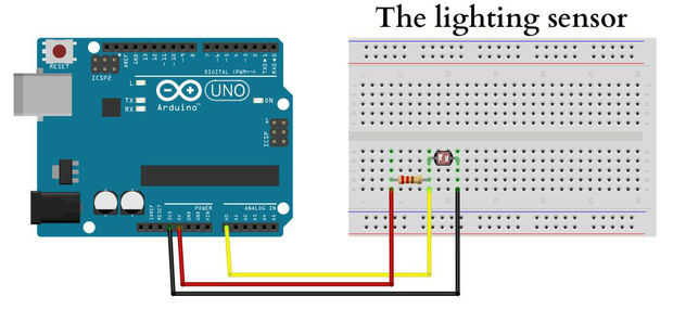Para el cableado, utilizamos un resistor como un puente divisor de tensión. Para este tipo de sensor es una resistencia de 10 k ohmios. En programación, hemos creado un valor (por ejemplo 20%) que le solicita el relé para cambiar estado. Por lo tanto, el relé pasa a "normalmente abierto" en "normalmente cerrado" a la energía el LED. Tenga en cuenta que es posible mejorar este sistema porque el usuario quiere no necesariamente los LEDs de luz cuando la habitación está oscura. Para ello, es necesario instalar un interruptor que permita para cortar voluntariamente la fuente de LED.