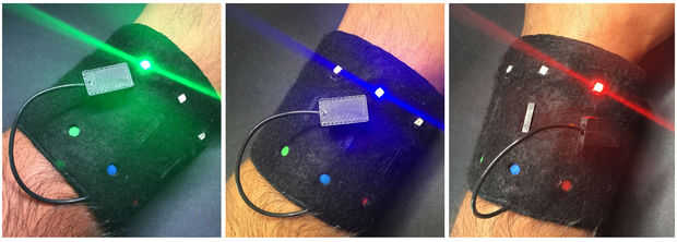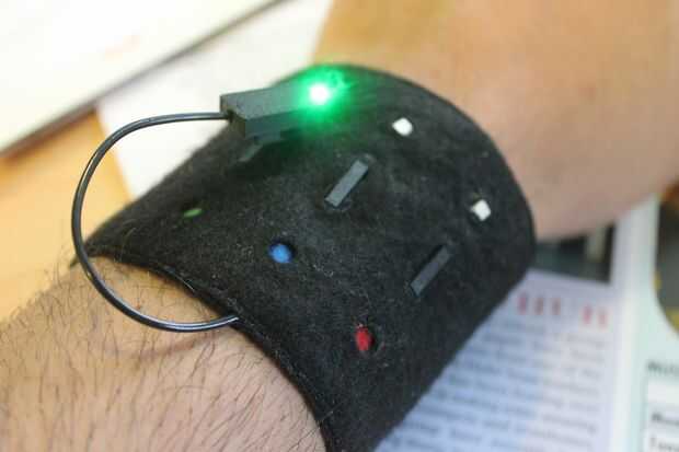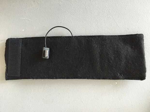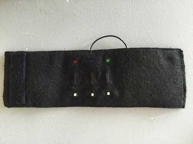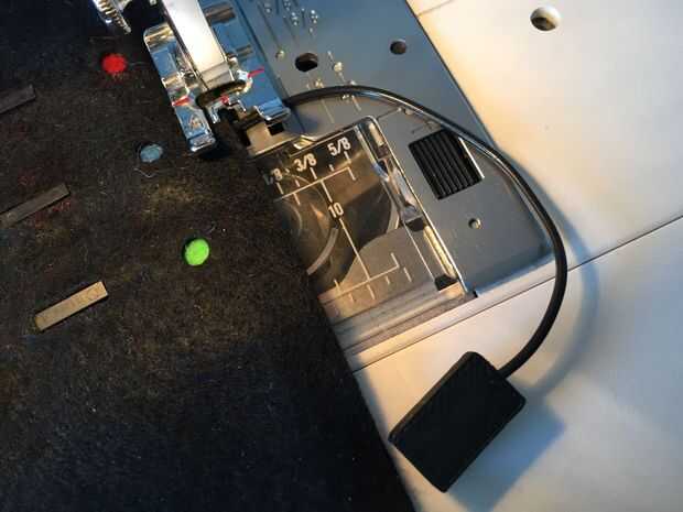 La etapa final es para coser las capas superior y base de fieltro juntos, asegurándose de que hay una sección a la izquierda plegada para el botón de popper y que una pequeña parte del cable del interruptor se inserta directamente debajo el LED azul para que se asegura una vez cosido. Uso una pequeña puntada recta para asegurar una aseada, visualmente atractivo acabado. Nota: Todos los componentes suaves están disponibles desde el Web de Kitronik.
