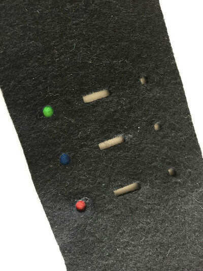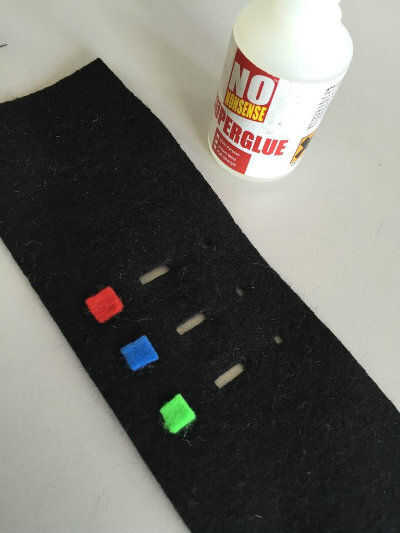 Con unas tijeras la tela, cortadas tres trozos pequeños de fieltro; uno rojo, azul y verde. Pegar estas piezas en el interior de la pieza de fieltro superior, directamente debajo de los tres círculos en el orden rojo – azul – verde