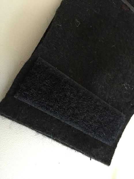 Pega el velcro en cada una de las piezas de fieltro. El lado suave debe ir en el borde derecho de la pieza de arriba y el lado del gancho debe ir en el borde izquierdo de la capa base.