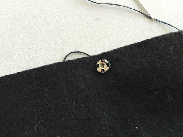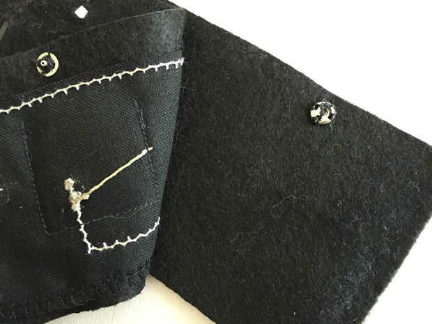 Coloque a la tela de circuito dentro de la tapa y base de fieltro piezas y marca donde irá el botón popper según la localización del soporte de la batería. Esto es para que la batería se puede cambiar. Mano coser los broches sobre el uso de hilo negro no conductor.