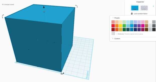Con el modelo completo, es tiempo para la magia. La caja que va a utilizar es un cubo de 9 pulgadas. Tome la forma de cuadro y arrástrelo hasta el plano de trabajo. Cambiar el tamaño a las dimensiones del INTERIOR de su caja de envío. Una vez que estés feliz con él, seleccione el objeto y la caja y haga clic en la opción de agujero a la derecha de la pantalla. Es herramienta de sustracción de TinkerCAD. Colocar el objeto dentro de la caja, teniendo en cuenta que probablemente tendrá que levantar por lo que ocupa el centro del volumen de la caja. Si no no habrá ningún texto de apoyo después de. Ahora, seleccione el volumen de la caja y haga clic en Color en el lado derecho de la pantalla. Esto devuelve volumen a la forma de la caja y forma de la caja solamente. Lo que no ves es que el interior son un ahora un vacío la forma misma de su objeto.