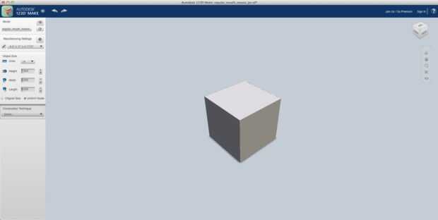Abrir Make 123D y utilizar "Import..." para seleccionar el archivo STL. Se te presentará a su cuadro en un espacio de trabajo gris. En este punto, compruebe que sus dimensiones coinciden con la realidad. He encontrado que la importación puede reducir tamaños. Si esto sucede, no se preocupe. Simplemente ajuste el panel de la izquierda.