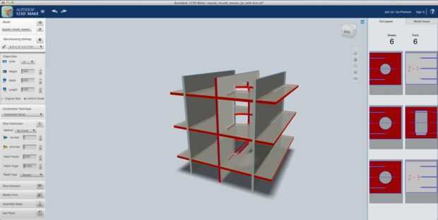 Cuando haya terminado de girar ejes y reproduce las fases de montaje, listo láser corte. Ha habido un adelanto de lo que tu corte de hojas se ven como todo el tiempo que has estado trabajando en el 123D. Usted puede ajustar el tamaño de la hoja a la izquierda y ver el resultado a la derecha. Hay una opción personalizada útil cuando te atrancas con hojas irregulares como lo hago. Haga clic en planes de conseguir en el panel izquierdo de la parte inferior y exportar el formato de archivo preferido.