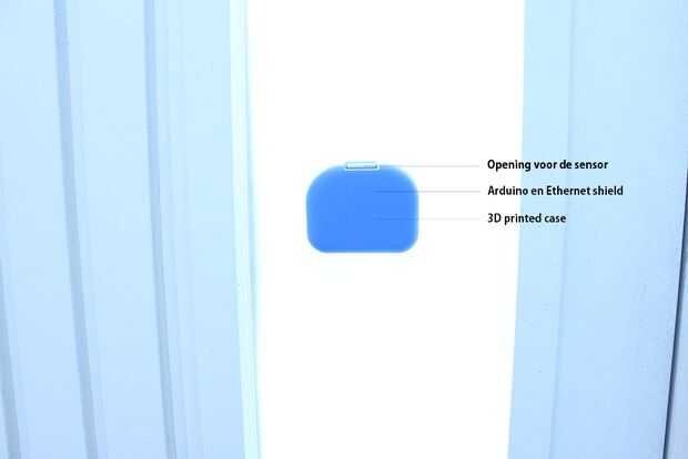 Voor het ophangen básica ik dubbelzijdig, dit omdat de caso nogal licht es maar de arduino en sensor toch wel wat peso hebben. Zorg dat er genoeg ruimte es de maar caso op que dat de sensor zit enorme, de het breadbord es vastgemaakt aan de binnenkant van de caso.