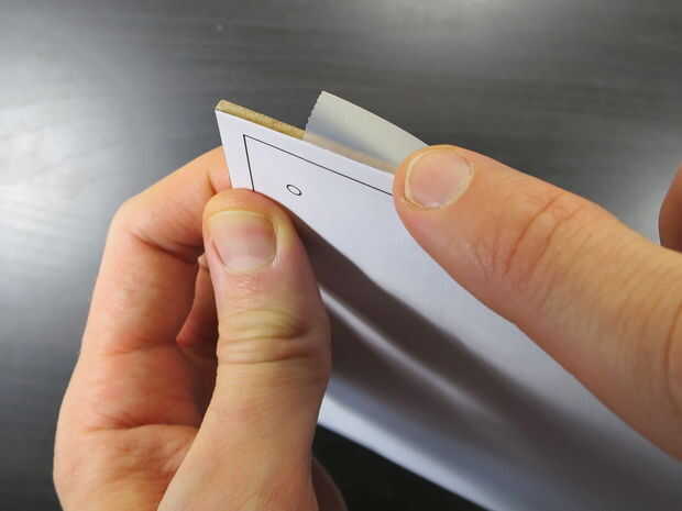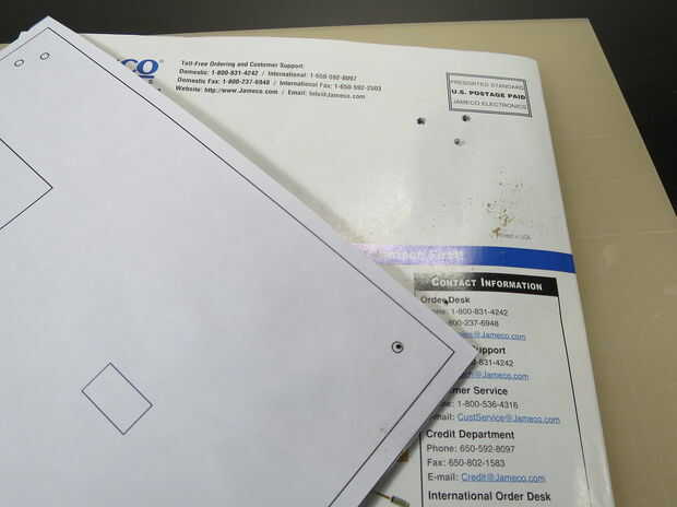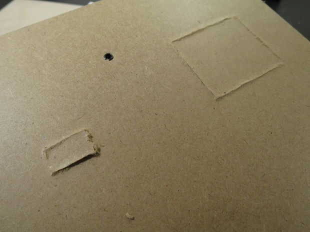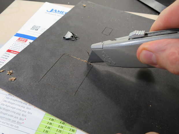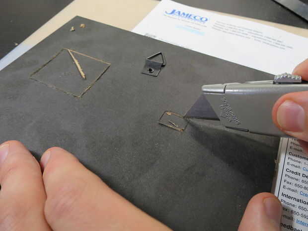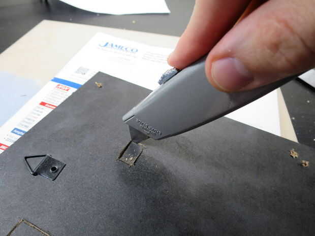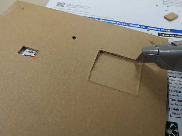 El rectángulo pequeño para el conector de alimentación será más difícil de cortar a través, como no hay mucho espacio para mover el cuchillo. Puede que tengas mejor suerte usando la punta del cuchillo en las esquinas y empujando hacia abajo para cortar los bordes cortos del rectángulo.