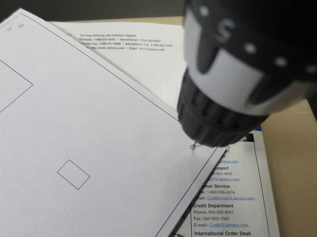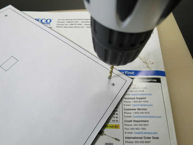 Poner un poco pequeño en el taladro para hacer agujeros piloto que serán más fáciles de hacer con precisión que un poco más grande. Usé un 1/16" bits. Usted debe ser capaz de sentir cuando llegas con el MDF y empezar a taladrar en el catálogo para no perforar muy profundo.