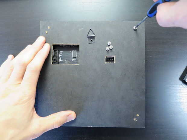 Limpiar el polvo del MDF, luego presione el MDF en el panel. Los pasadores de polarización deben sujetarlo para la fijación de los tornillos.