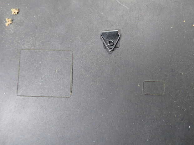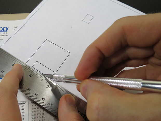 Use una navaja X-acto y una regla del acero inoxidable para anotar los rectángulos donde el escudo SmartMatrix y cable de alimentación llegará a través de MDF. El objetivo aquí no es para cortar el MDF, pero hacer profunda suficiente cortes que un cuchillo más pesado del deber puede seguir y terminar. Mantener la regla en el exterior del rectángulo, así que si el cuchillo se flexiona y se desvía de la línea recta el corte extra será en el MDF que es lanzado lejos.