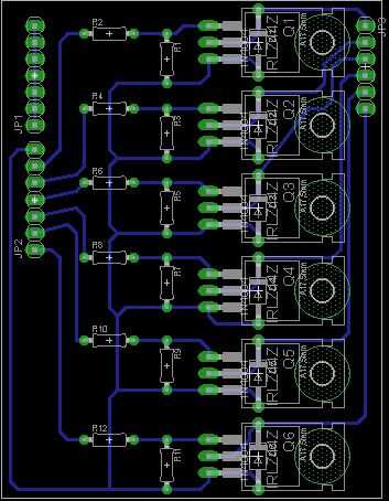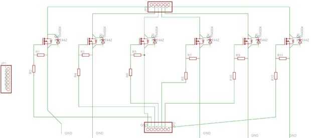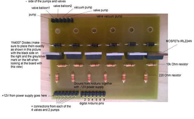 Hay básicamente 6 MOSFETs en paralelo que cada uno colocado como por ejemplo en este gran tutorial http://bildr.org/2012/03/rfp30n06le-arduino/http://bildr.org/2012/03/rfp30n06le-arduino/ con la excepción que colocamos los diodos en paralelo pero no a las bombas o válvulas de dren y fuente de los MOSFETs, que también trabaja. También hemos añadido a cada uno de los MOSFET una resistencia de 220 Ohm entre la puerta y pines digitales del Arduino, para no dejar alto voltaje dañe el Arduino. Para más detalles y razones de por qué hay que ser diodos en cada MOSFET así como lo que es un MOSFET, sugiero leer algunos tutoriales. Lo anterior mencionado es un buen punto de partida y debe ser suficiente para nuestros propósitos.