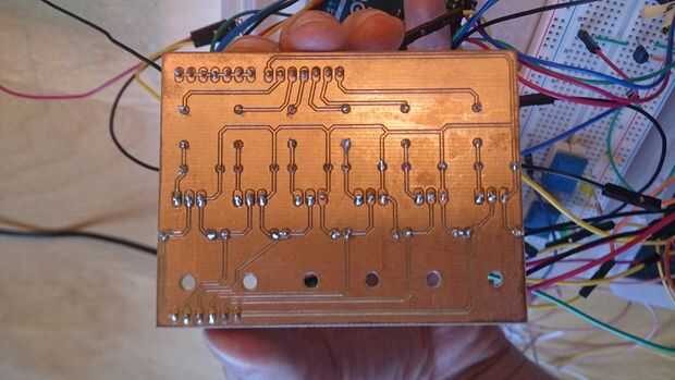 Asumimos para este paso, que sabes de la soldadura (si no le sugerimos al primer reloj algunos tutoriales para aprenderlo) y dar a que usted una explicación sobre lo que tiene que soldar a que pin en el tablero. Usted tiene que soldar 2 x 7 conectores (en la foto más arriba), 1 x 7 conectores (en la foto abajo). También tienes que soldar todos los componentes (resistencias, MOSFETs, diodos) exactamente como en la imagen con las notaciones y entonces debe ser terminado con la Junta. La otra imagen muestra el otro lado de la Junta.