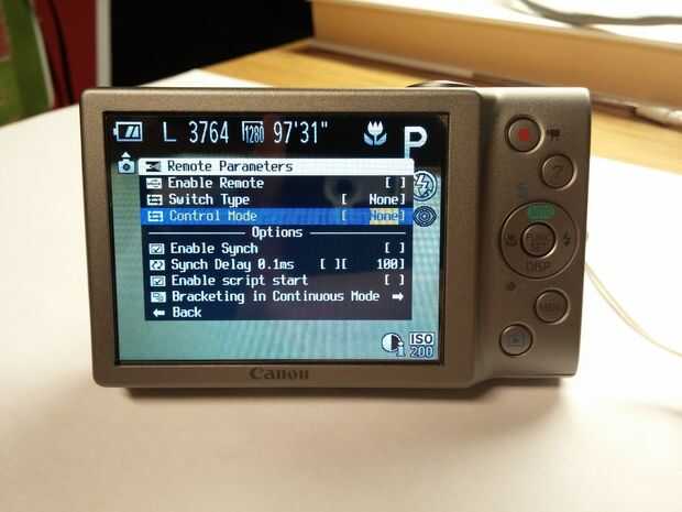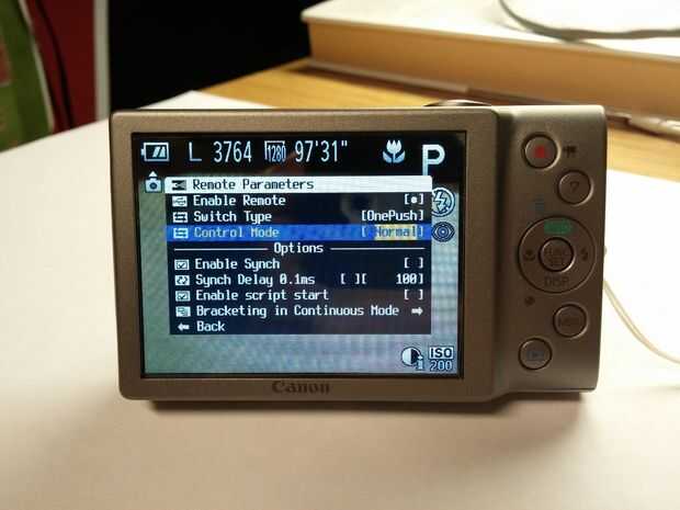 Una vez que la cámara está en modo de < ALT >, pulse el botón menú de tu cámara para acceder al menú principal de CHDK. Desplácese hacia abajo hasta "Configuración de CHDK" y selecciónelo. Desplácese hacia abajo hasta "Parámetros remoto" y selecciónelo. Ahora debería ver un menú que parece foto 2. Por ahora, hemos creado la cámara para enfocar y tomar una foto cuando recibe un disparo de Arduino. Utilizando los botones de la cámara, definir los parámetros remotos para habilitar remoto, interruptor de tipo "OnePush" y el modo de Control "Normal". (Ver imagen 3)